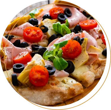 37 - mit Schinken, Ei und Champignons in Tomaten-Sauce mit Käse überbacken 14,50€