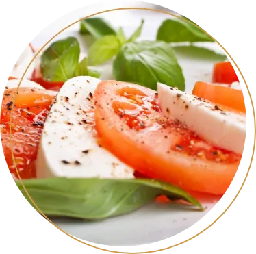 Mozzarella mit Tomaten und Basilikum 2, 4, f